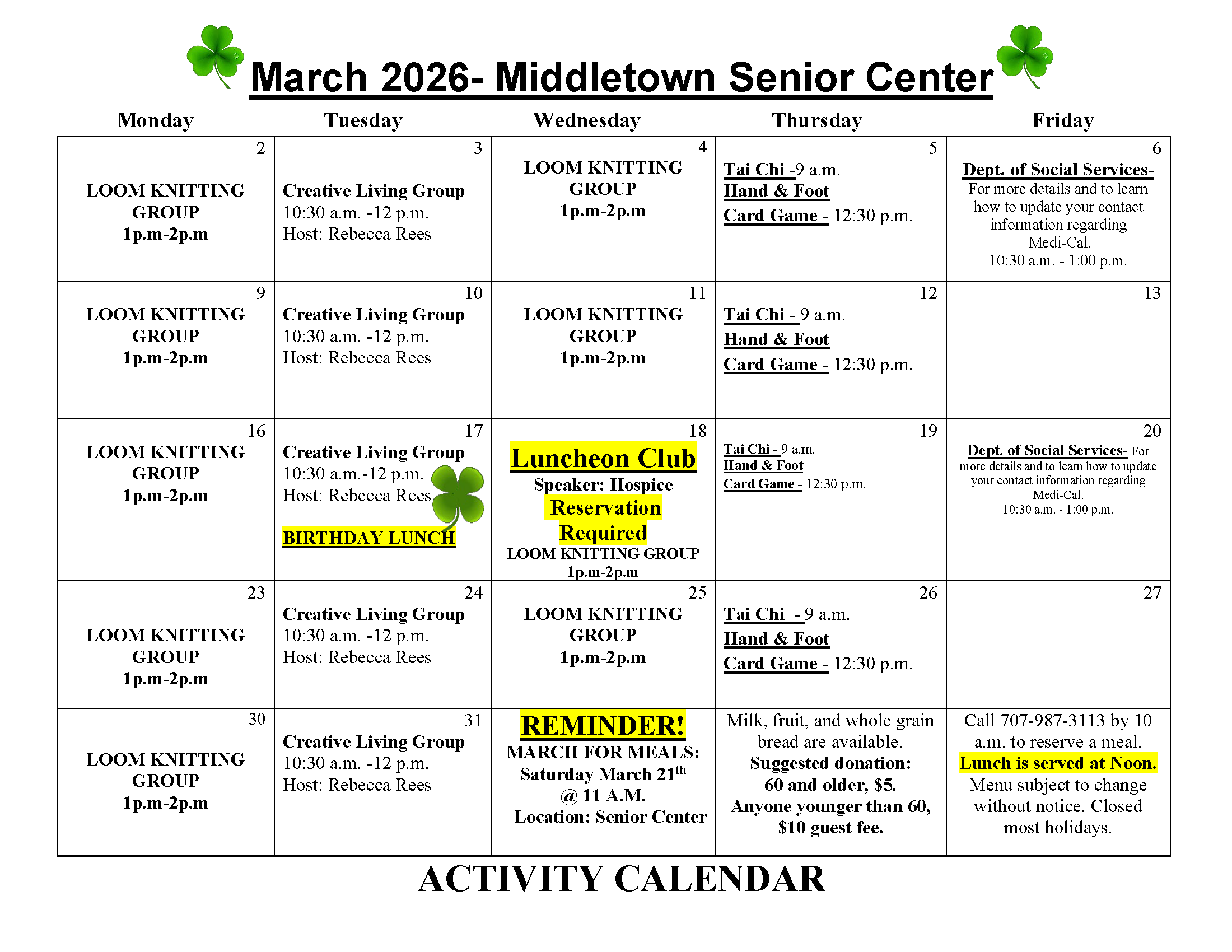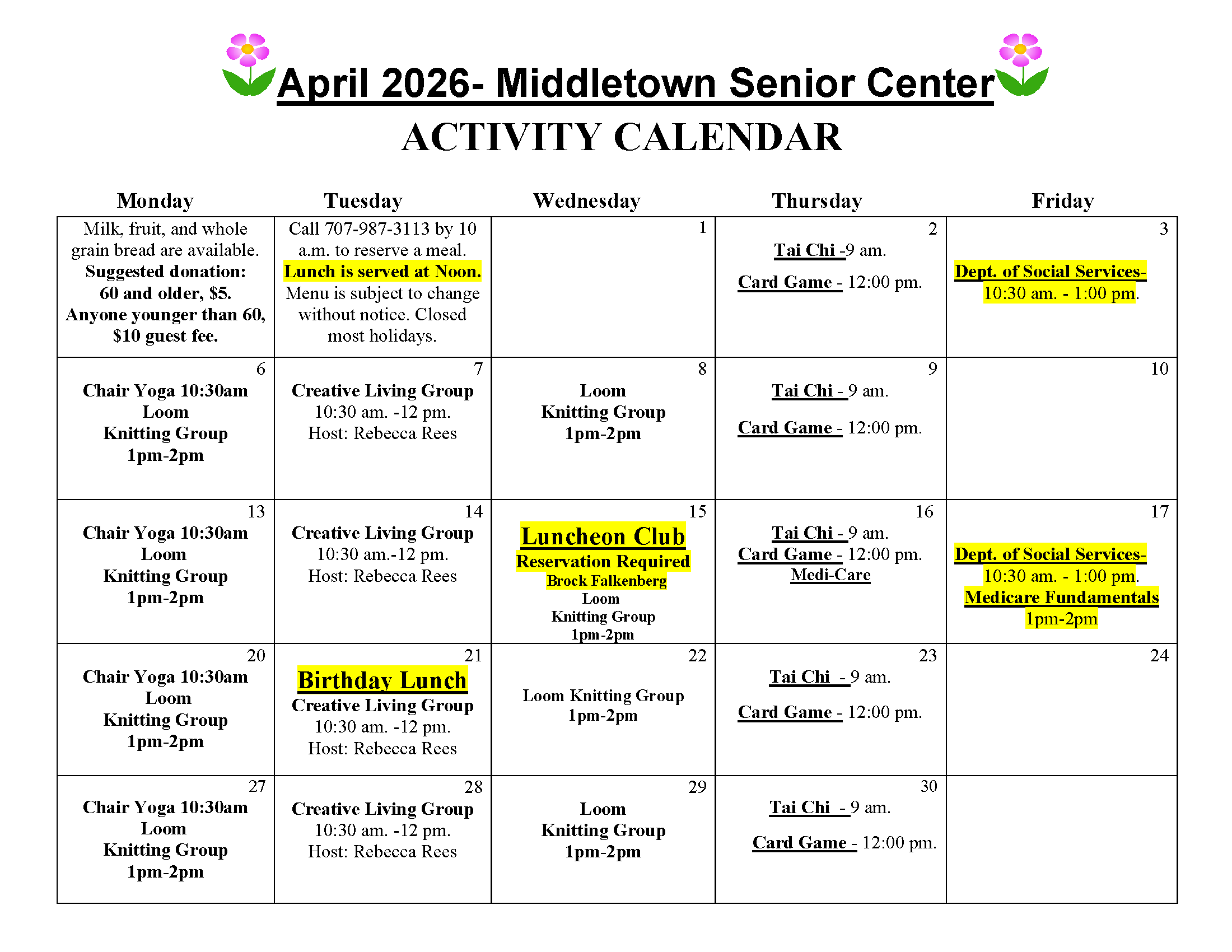 Tuesdays: 9 am at Clearlake Community Senior Center, 3245 Bowers Ave., Clearlake and 11 am on ZOOM