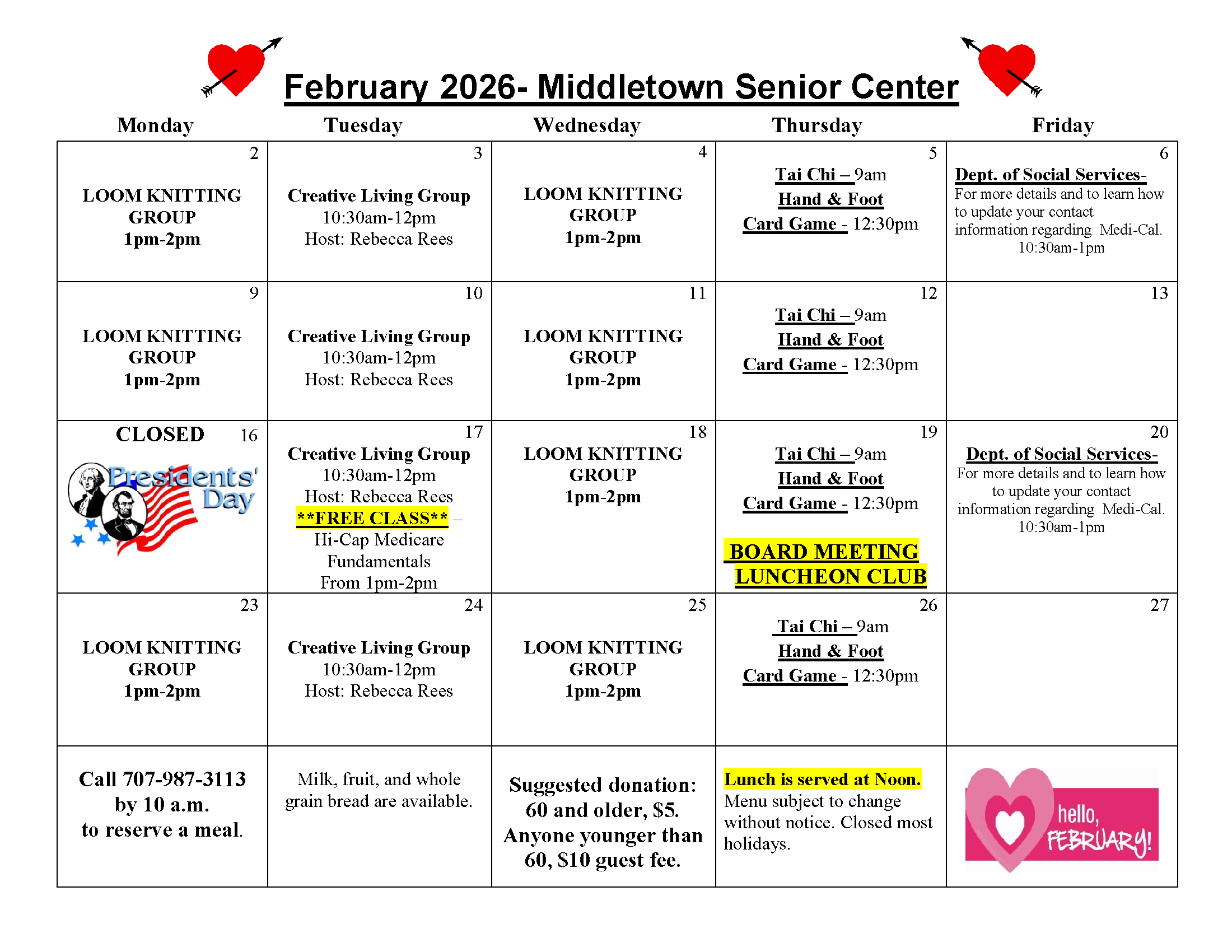 Thursdays: 9 am at Middletown Senior Center, 21256 Washington St., Middletown and 1 pm on ZOOM