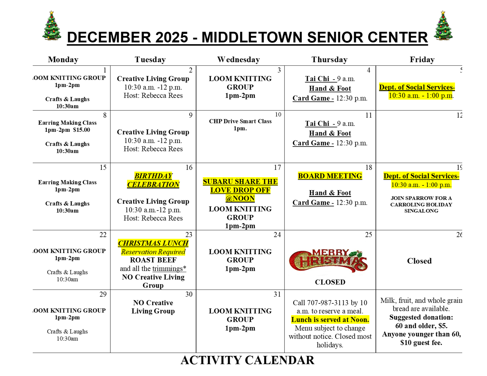 Wednesdays: 9 am at Lakeport Senior Center, 527 Konocti Ave., Lakeport.