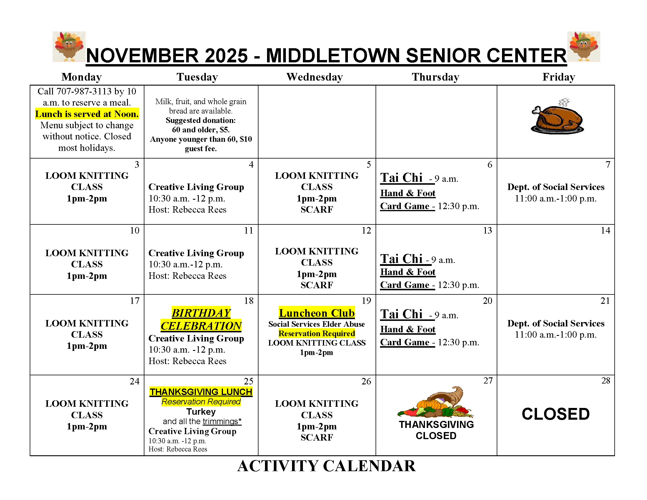 Tuesdays: 9 am at Clearlake Community Senior Center, 3245 Bowers Ave., Clearlake and 11 am on ZOOM